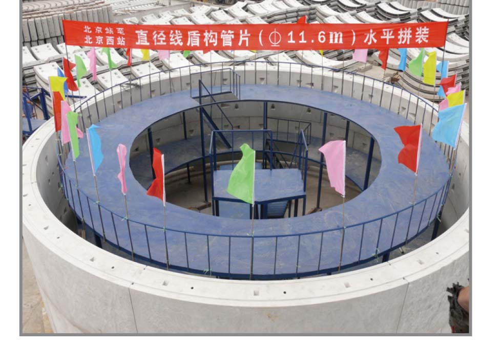 北京站至北京西站地下直径线,采用通用环管片,每环分为9块,管片外径11.6m、内径10.5m、厚550mm、环宽1.8m,每环管片重量86t,是Φ6m盾构管片的5倍。它的研制成功,填补了国内大直径铁路盾构管片生产的空白。