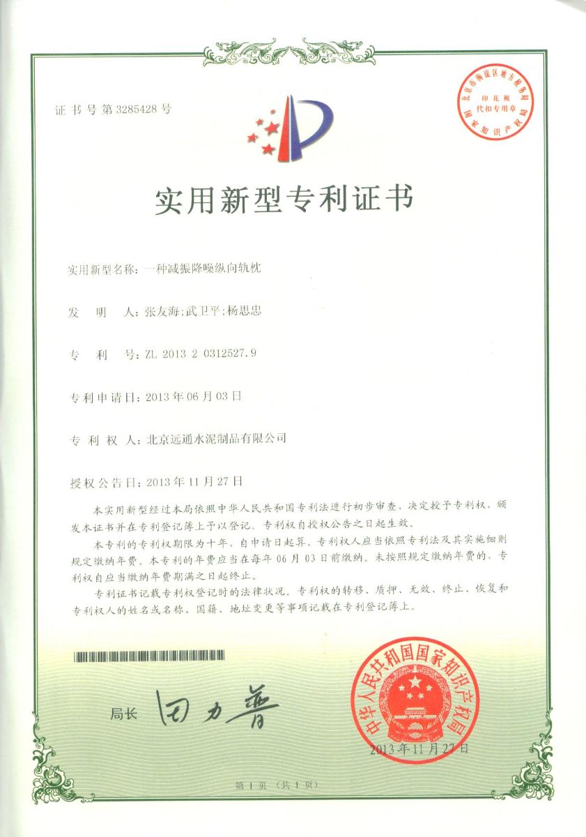 一种减震降噪纵向轨枕实用新型专利证书