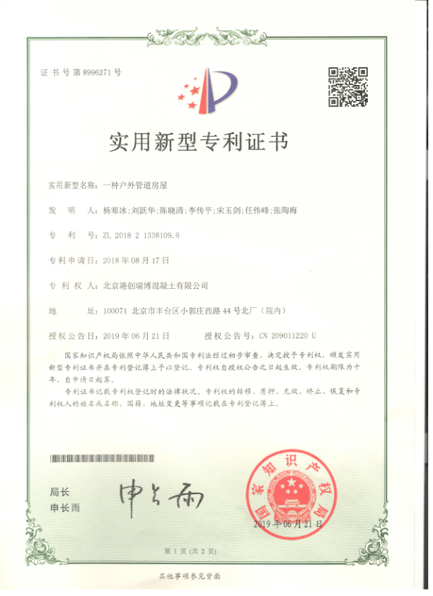 2019 年 上 半 年,公司喜获“一 种户外管道房层”和“盾构管片钢筋 架模具”两项实用 新型专利。