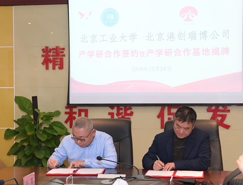 12月24日上午,北京工业大学与北京港创瑞博公司校企合作签约暨产学研基地揭牌仪式在北京市政工业基地举行。双方联手合作产学研基地建设,旨在落实国家科教兴国战略,促进科技创新,加快企业经济发展和高校科研成果转化。