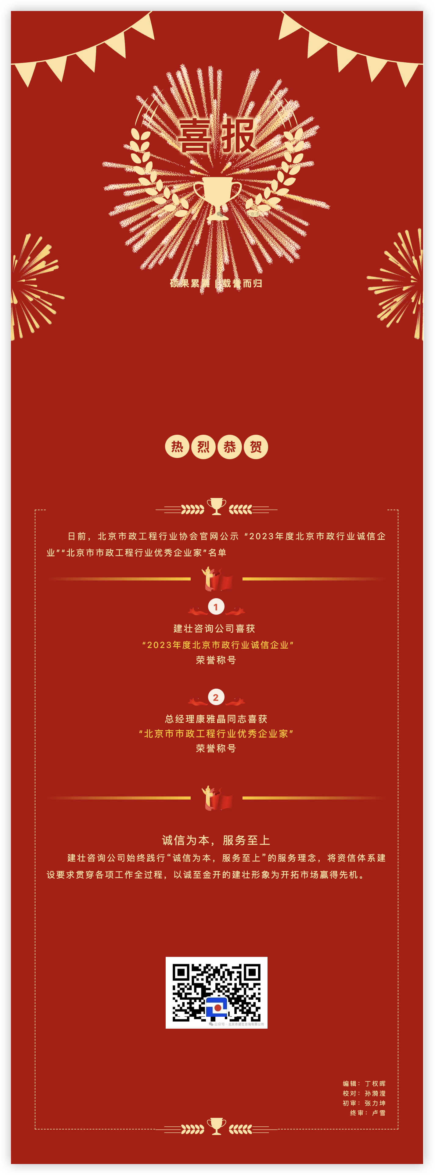 喜报!建壮咨询公司荣获“2023年度北京市政行业诚信企业”荣誉称号