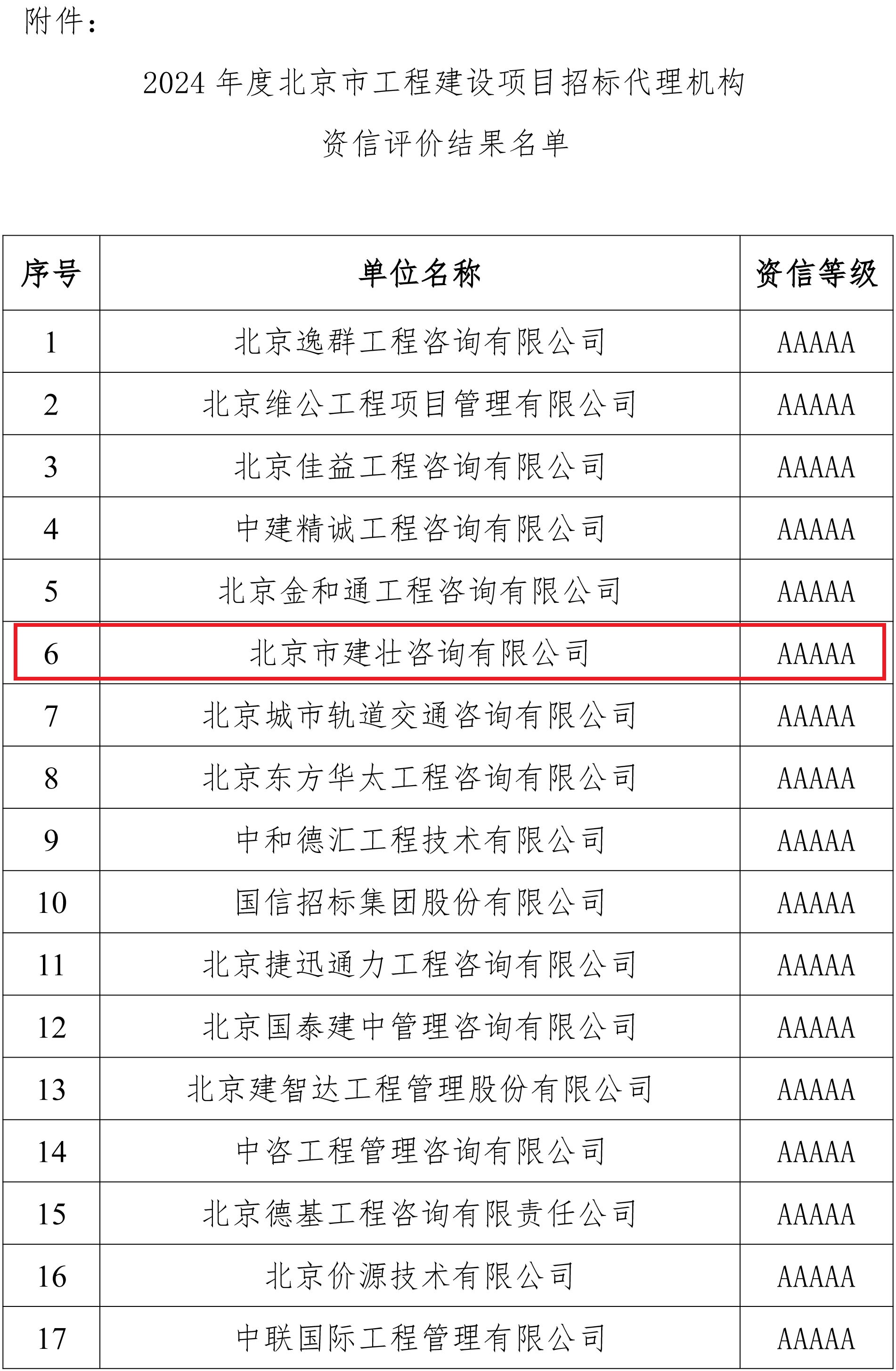 建壮咨询公司荣获“2024年度北京市工程建设项目招标代理机构资信评价”AAAAA级荣誉称号