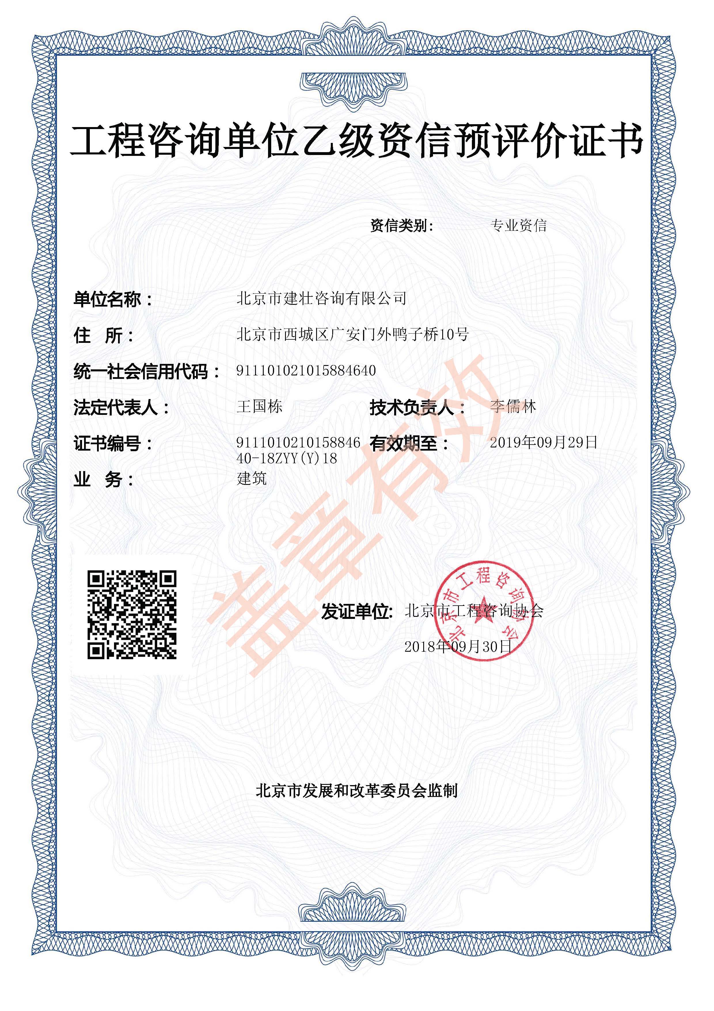 2018年9月30日,在经过北京市工程咨询协会公示后,我公司正式取得了工程咨询单位乙级资信预评价证书。我公司将继续秉承“诚信为本、服务至上”的原则,对所承揽的业务信守合同,重视质量,讲求信誉,为客户提供高效优质的全过程工程咨询服务。