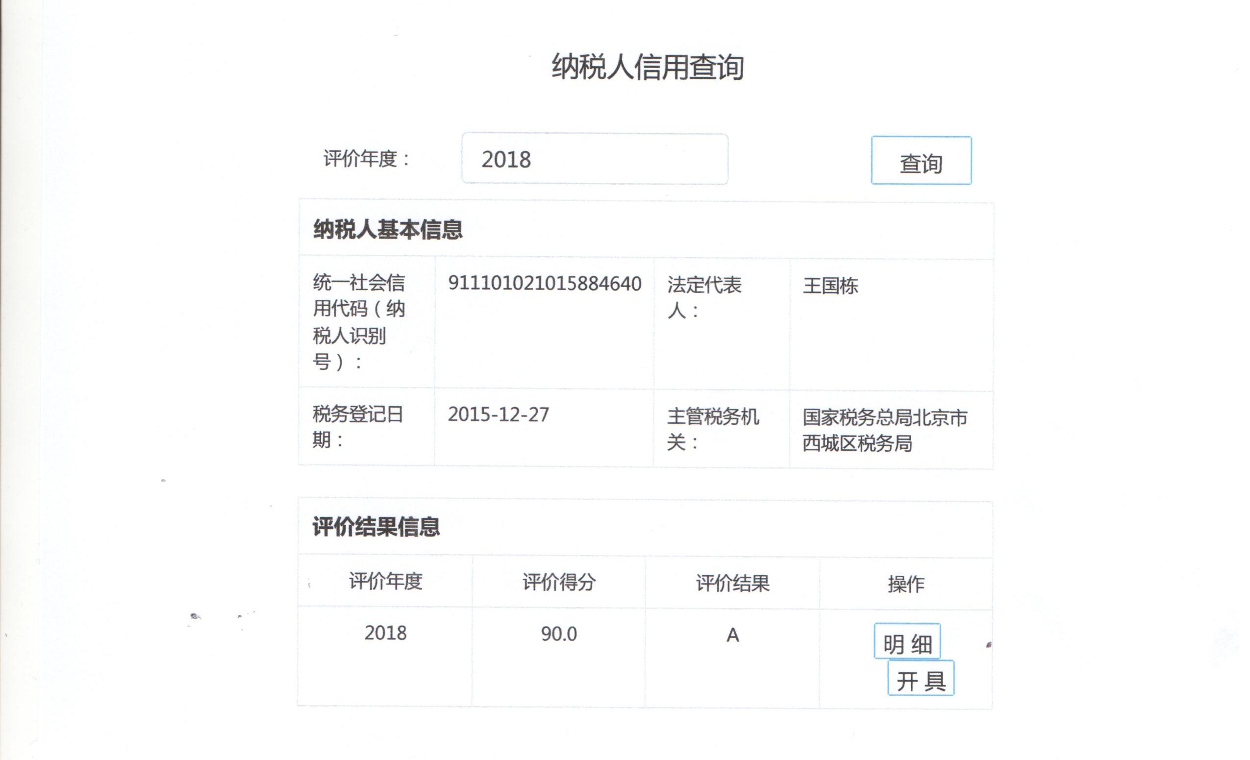 我公司于近日通过国家税务总局及北京市税务局2018年度纳税信用A级企业评价。此项荣誉反映了我公司在依法纳税、回馈社会、承担相应社会责任方面得到了国家及北京市税务系统的高度认可,树立了良好的公司形象。