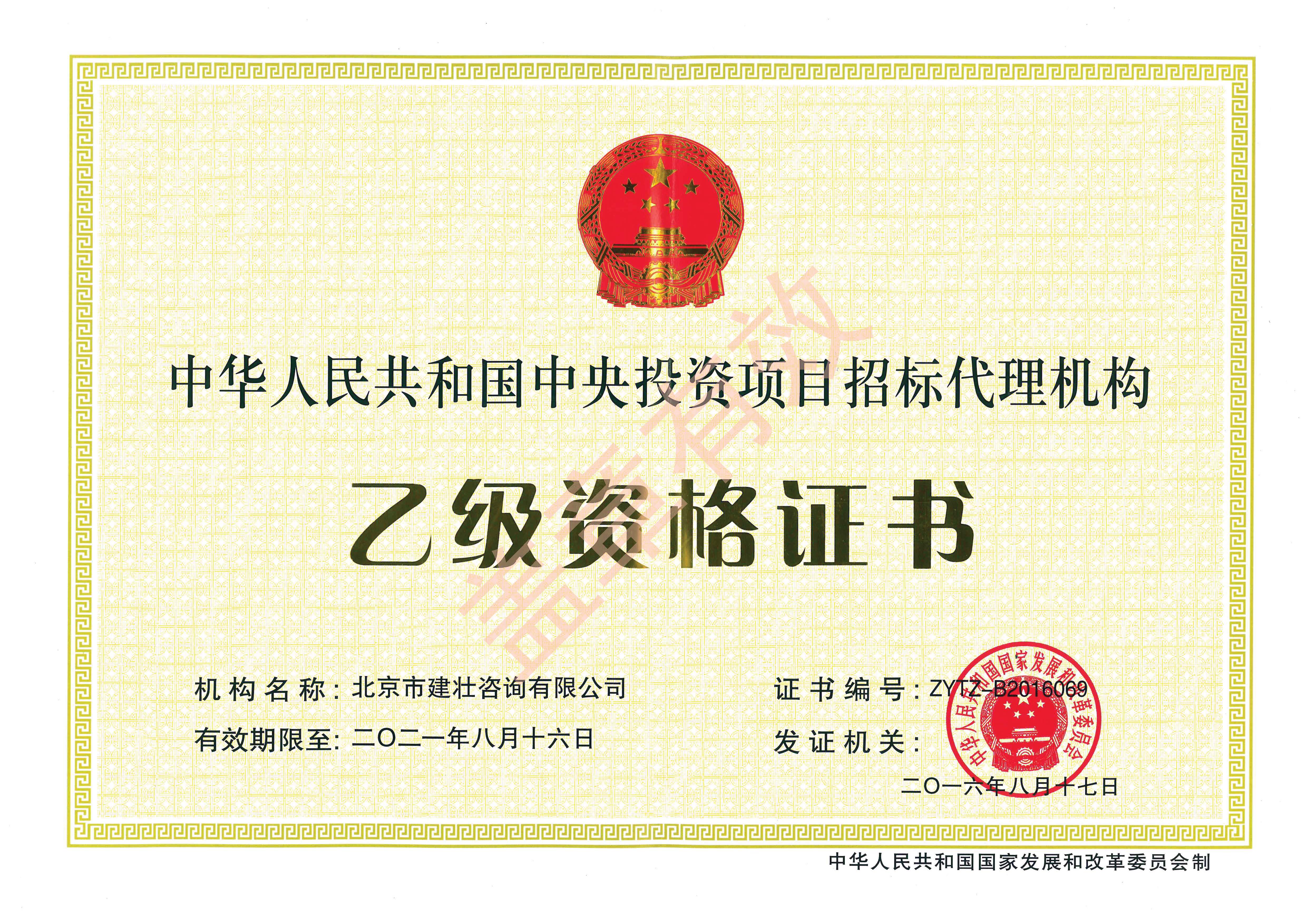 中央投资项目招标代理机构乙级资格证书