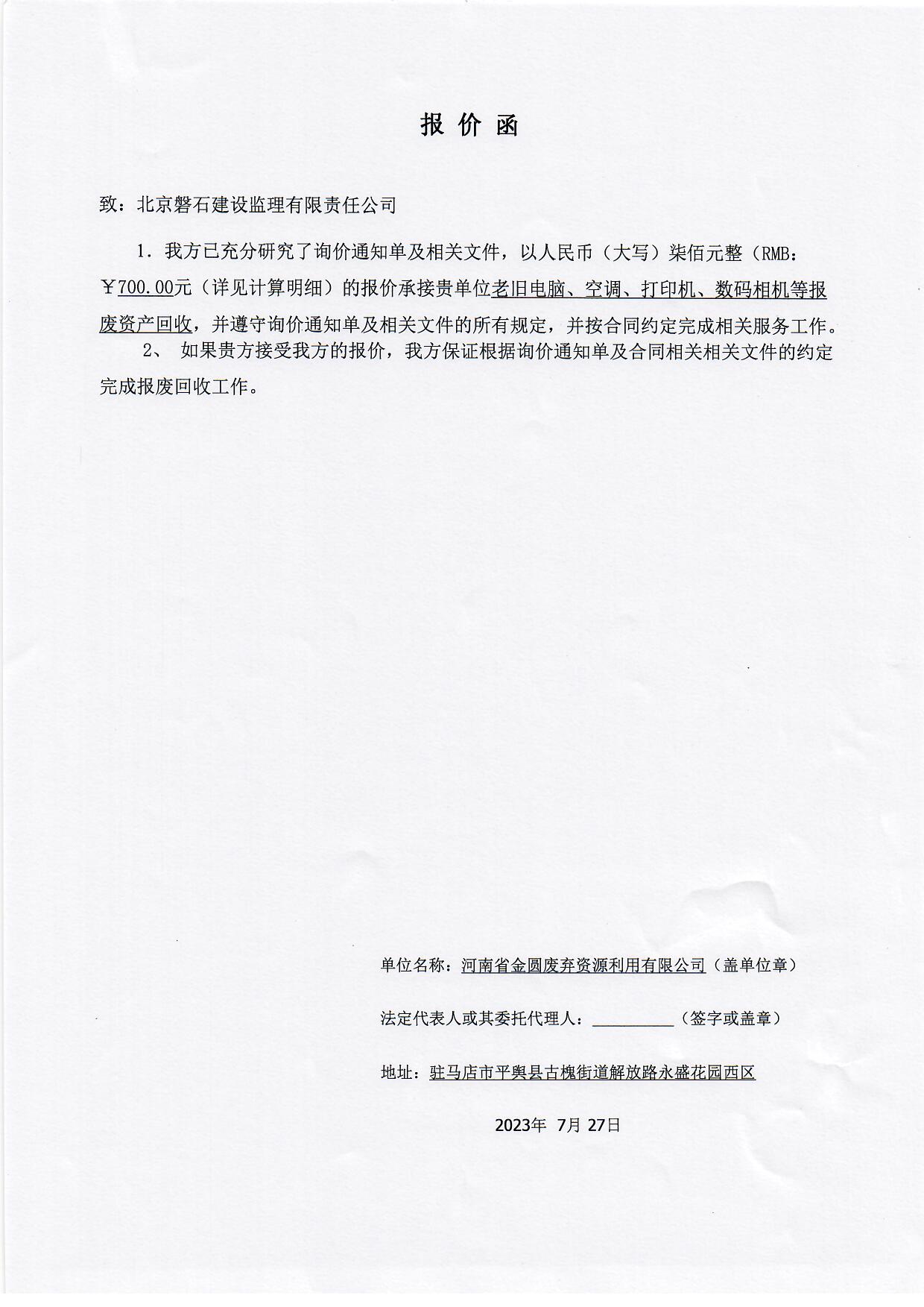 根据现场路勘情况,截至2023年7月27日16时30分,我单位共收到六份报价函,现将北京中源顺达再生资源贸易中心、河南创先科技环保有限公司、北京百物废日物资回收有限公司、北京亿兴源再生资源回收有限公司、北京盛世铭垚环保科技有限公司、河南省金圆废弃资源利用有限公司报价(详见附件1、2、3、4、5、6)予以公示,公示期为2023年7月27日至2023年8月4日。