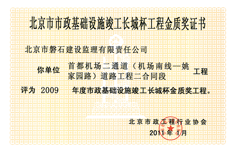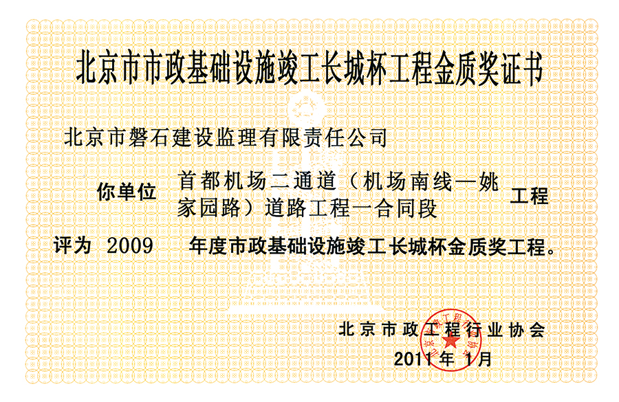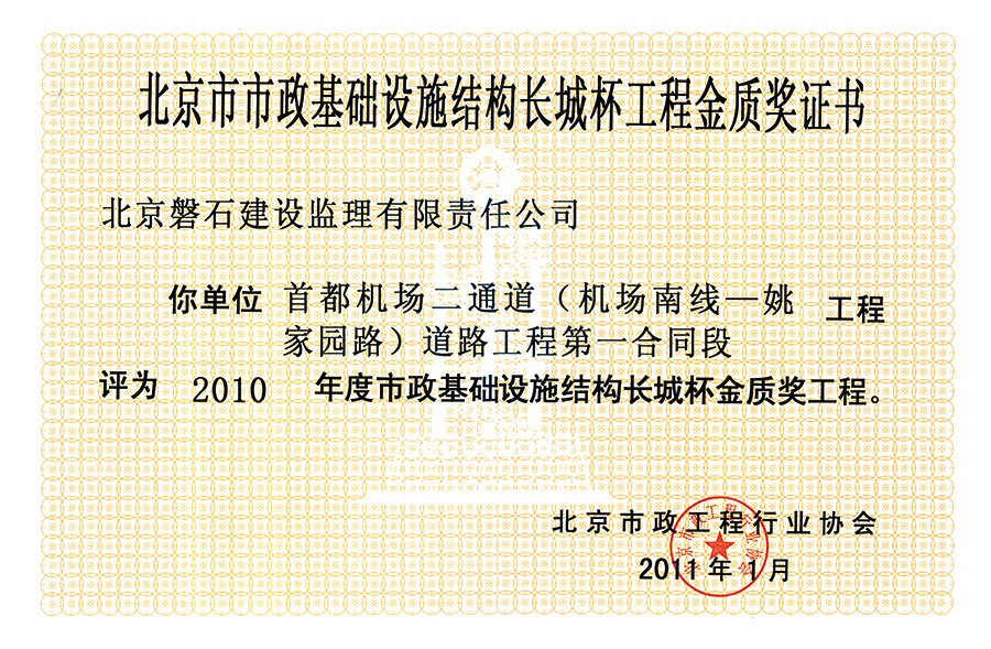 本项目两个合同段分获2009、2010年度市政基础设施竣工长城杯金质奖工程。
