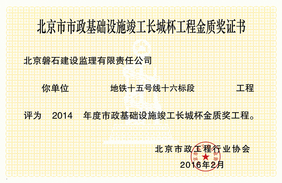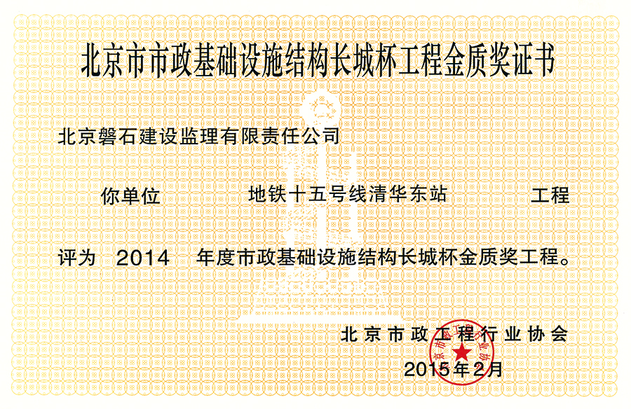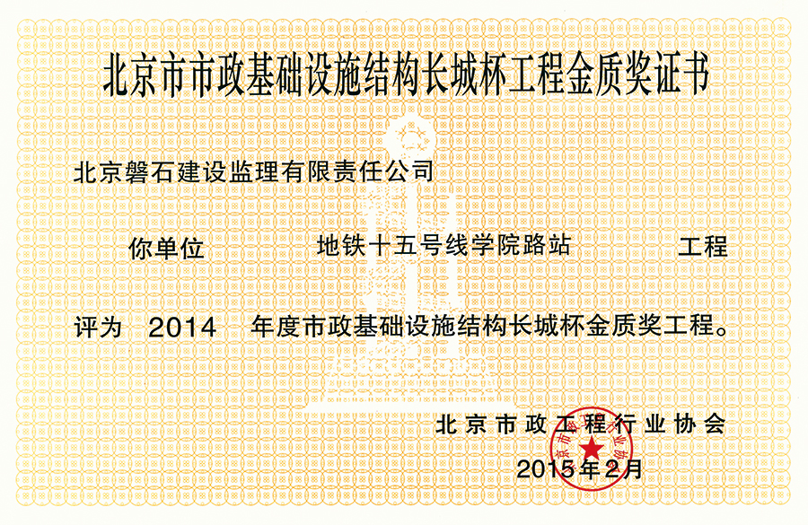 15号线15、16标段分别获得2014年竣工长城杯金质奖,同时学院路站和清华东路站也分别获得2014年结构长城杯金质奖