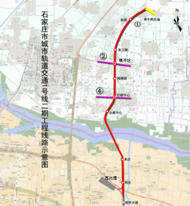 石家庄市轨道交通1号线二期工程与1号线一期工程衔接,呈南北走向。工程起于洨河大道站(不含),止于东洋站,沿秦岭大街和新城大道敷设,线路全长13.543km/双线,全为地下线,正线最小曲线半径350m,最大坡度为29‰。共设车站8座,平均站间距为1.684km。本工程南端与1号线一期洨河大道站相接,北端设停车场1处,为南牛停车场。在西庄站设置出入线与西兆通车辆段相接。