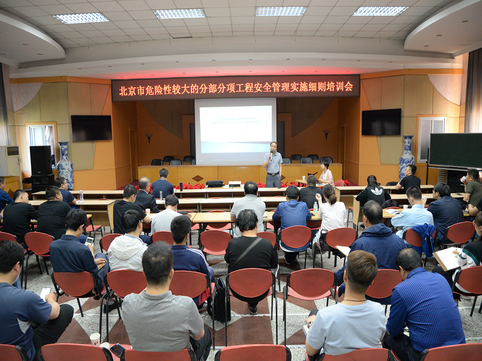 2019年5月13日下午,公司在五楼礼堂举办《北京市房屋建筑和市政基础设施工程危险性较大的分部分项工程安全管理实施细则》培训会。公司领导靳利军、高明生、高飞、马少军、刘保东;公司技术中心、安全管理部、材料设备部、工程管理部;各分支机构及在京项目部经理、总工、安全总监、安全负责人及相关人员参加此次培训。