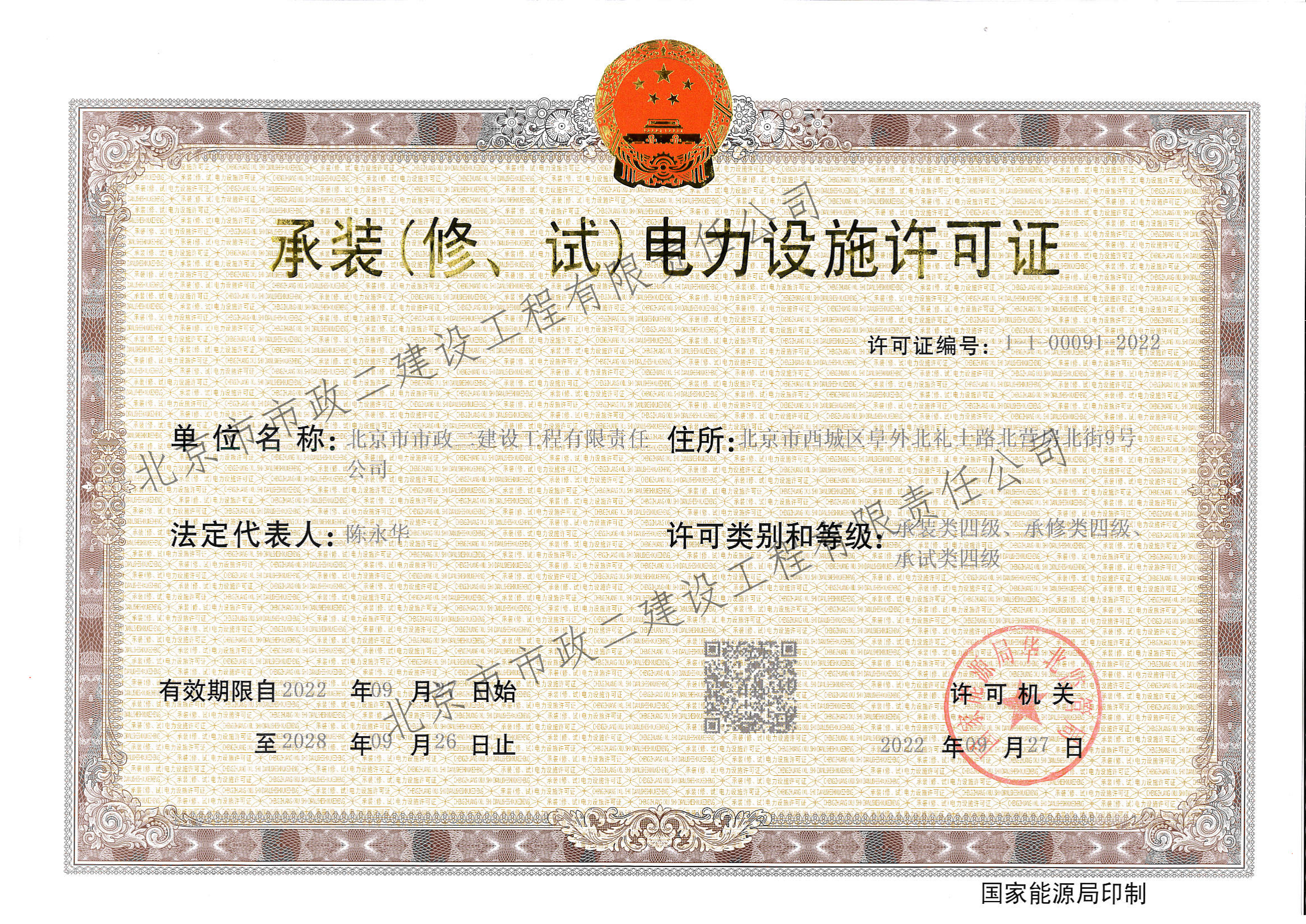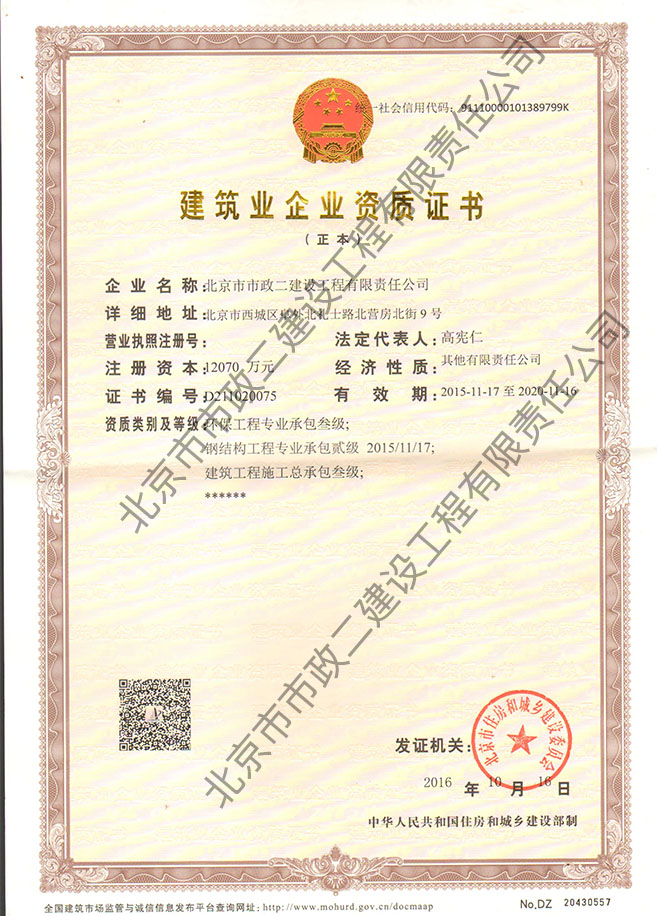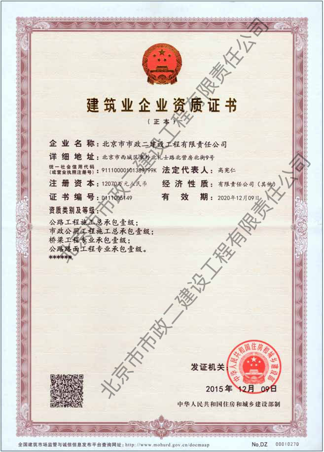 北京市市政二建设工程有限责任公司具有悟空体育官网入口 施工总承包、市政公用工程施工总承包、桥梁工程专业承包、公路路面工程专业承包的4个壹级资质,具有钢结构工程专业承包贰级,具有环保工程专业承包和建筑工程施工总承包2个三级资质、具有承装(修、试)电力设施许可证。