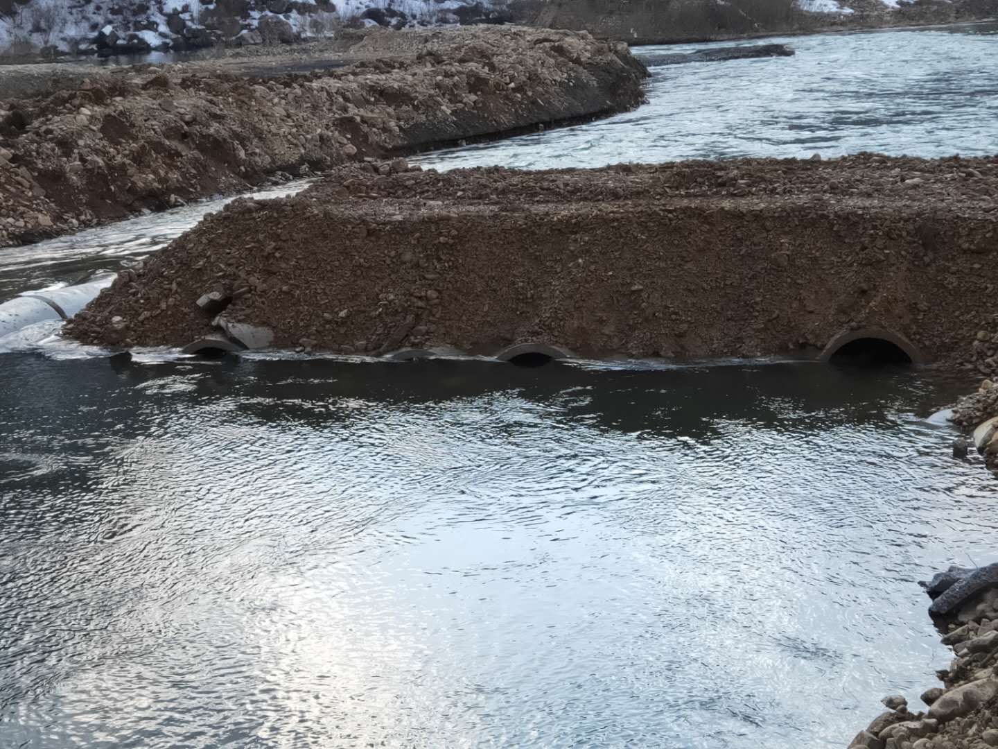 由于通化地区此时正值水库春汛放水期,水流量较大,项目将河水导流,搭设施工便道,在便道下设置足量的倒流管道,保证河水正常流通。