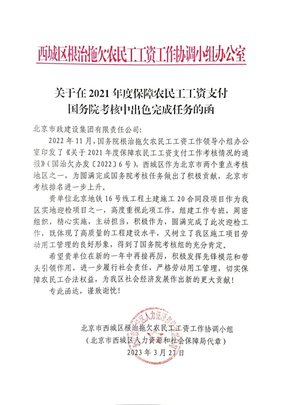 近日,16号线20标收到来自西城区人社局的感谢信,信中对项目圆满完成国务院考核任务,促进北京市排名进一步上升表示感谢,让全体团员深感自豪。