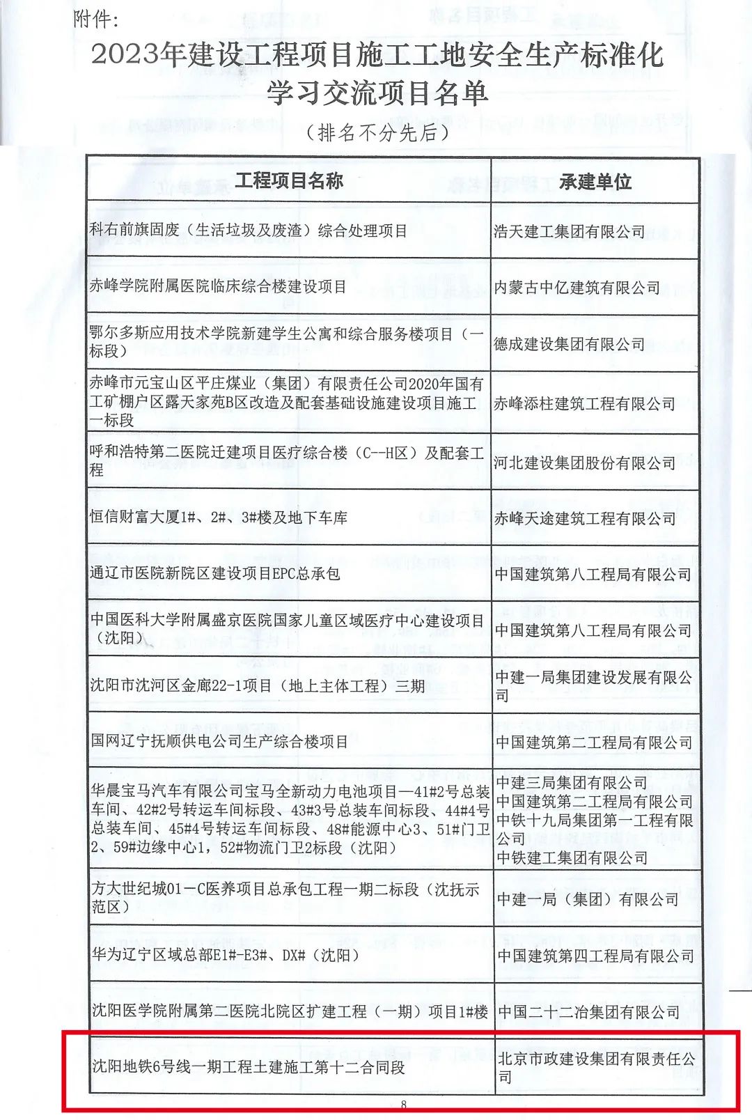 沈阳地铁6号线一期工程土建施工第12合同段荣获中国建筑业协会建设工程项目施工工地安全生产标准化工地,此外,项目连续两年荣获辽宁省公安年度全省企业事业单位治安保卫工作集体及个人一等功奖励,多次作为沈阳地铁参加代表接受当地媒体报道,参与强降雪除雪、社区防疫城市公共安全应急响应,先后承办了东北大学师生来沈水路站的观摩交流和沈阳市总工会宣传文化大篷车走进地铁建筑工地慰问演出等活动,得到了街道及各外部监管部门的一致好评。
