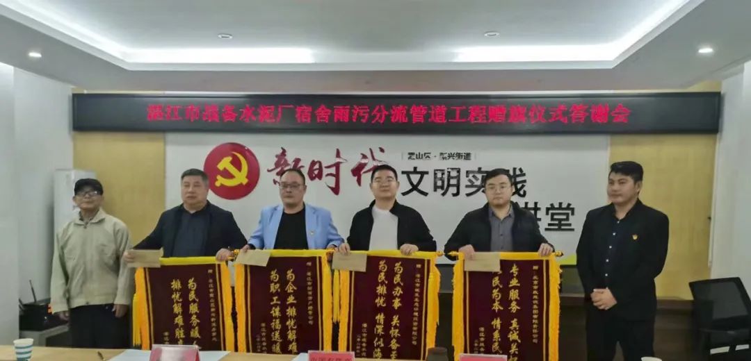 2月2日,湛江市战备水泥厂及宿舍职工代表在新兴街道向公司赠送锦旗及感谢信,衷心感谢项目为战备水泥厂宿舍区及周边道路排水管道建设所做的努力。
