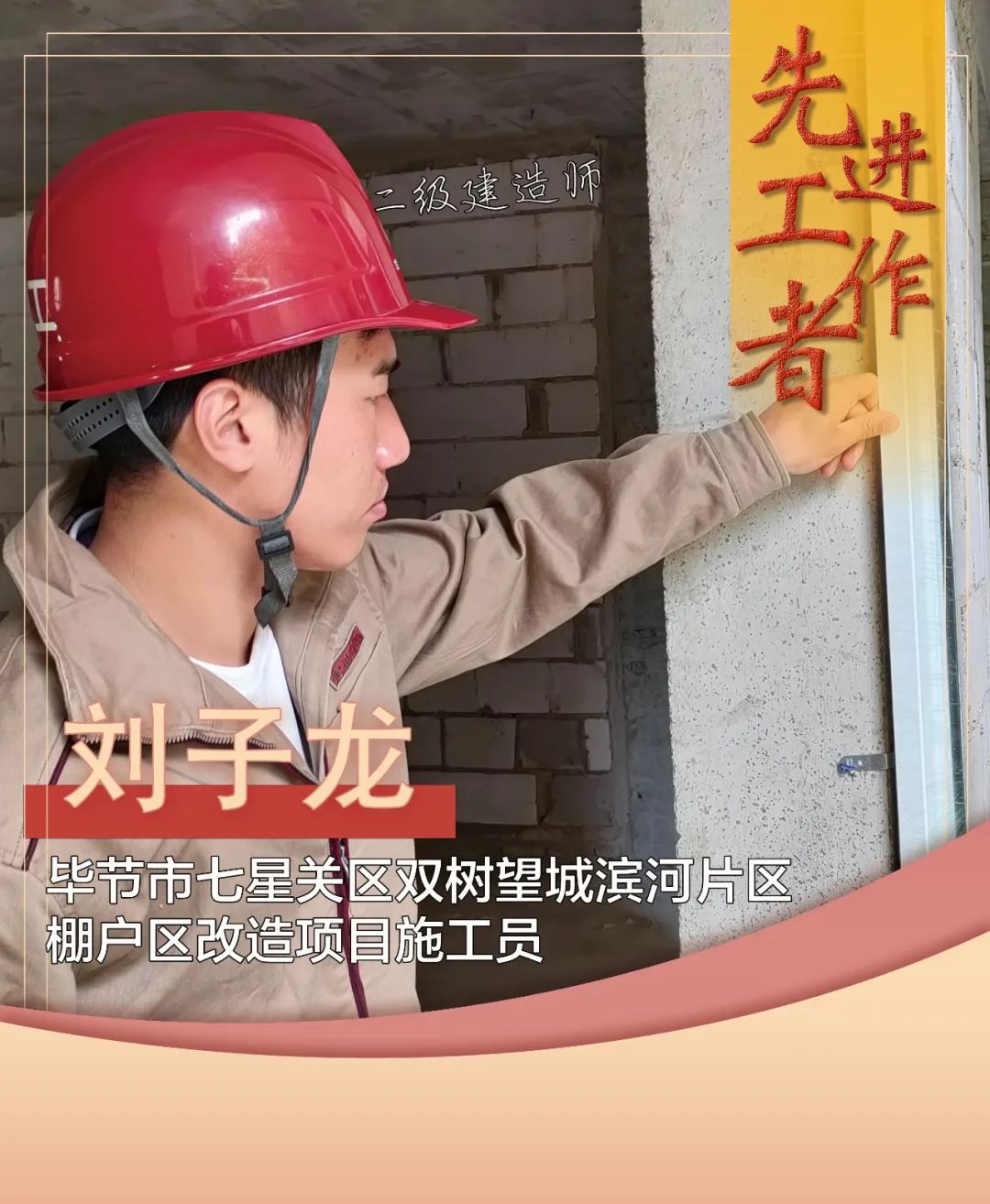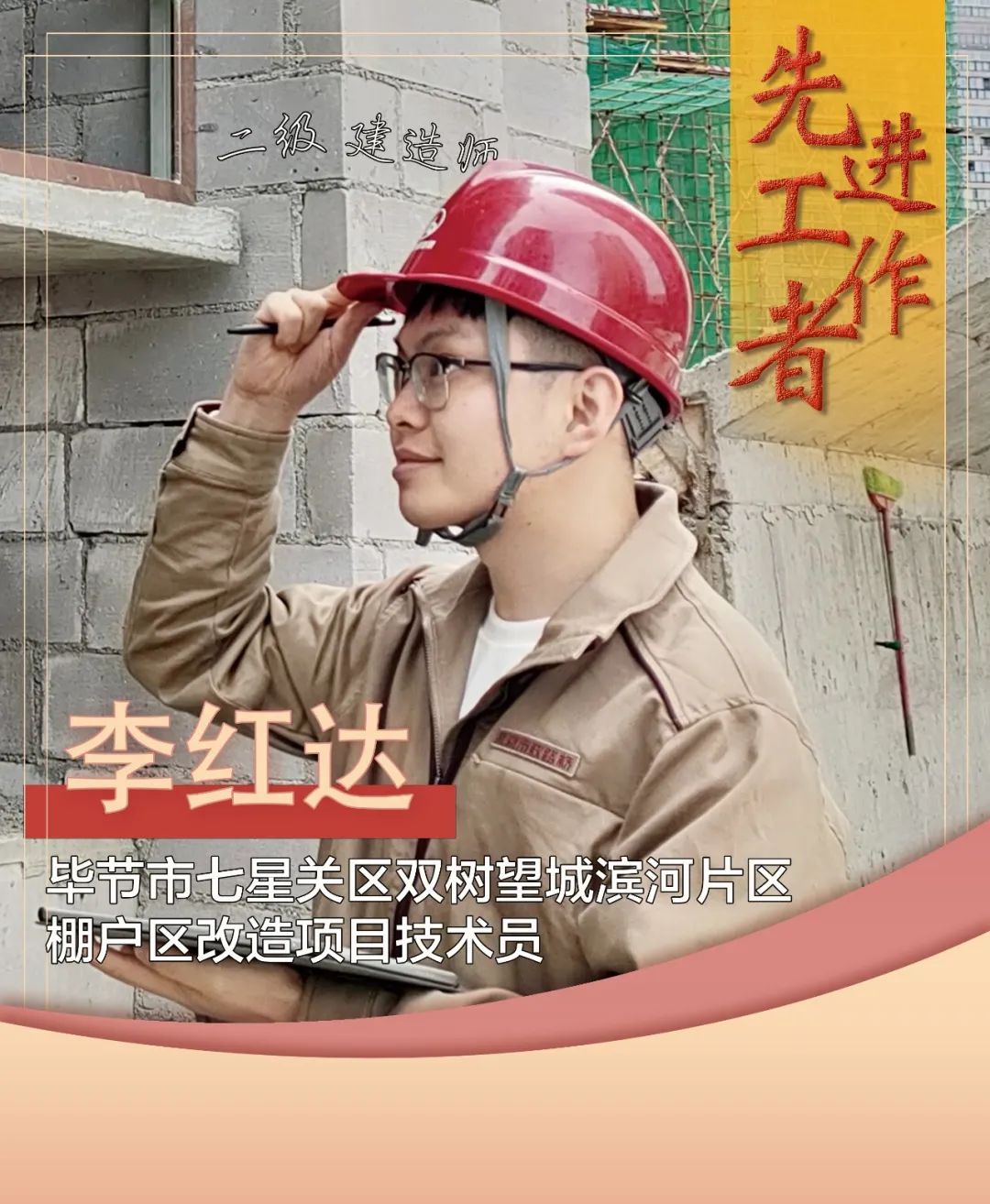 李红达,二级建造师,毕节市七星关区双树望城滨河片区城市棚户区改造建设项目1#、2#、3#安置地块工程技术员,爱岗敬业、任劳任怨,在技术质量管理工作岗位上不断贡献新力量。