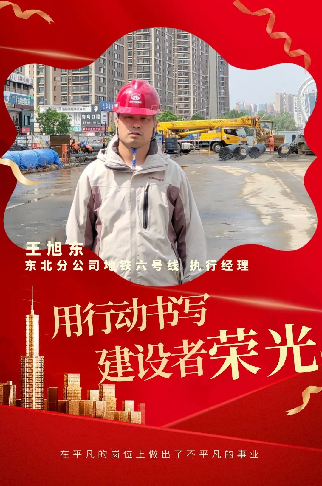 王旭东,沈阳地铁6号线项目执行经理。自2009年参加工作以来,从地铁2号线北延线的施工员成长为地铁6号线工程项目执行经理。他全力推行精细管理,带领项目团队实干争先,攻坚节点。多次荣获市政集团、市政四公司“先进个人”荣誉称号。