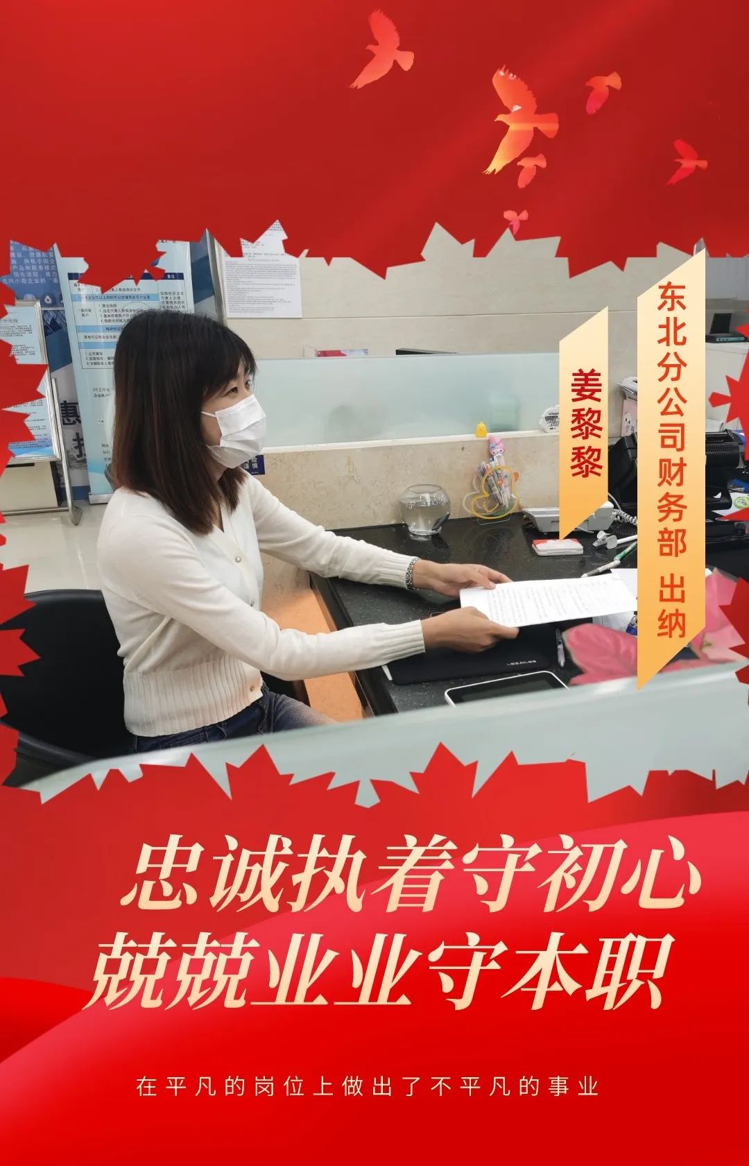 从每月到各银行打印对账单到认真梳理银行余额调节表,从核对分公司人员保险、公积金、个人所得税数据到完成缴纳、代扣代缴,从合作项目日常业务联系到收付款管理、台账统计等,她认真负责,勤奋实干,严格执行规章制度,坚持做到日清月结。在做好本职工作的基础上,积极发挥特长,代表东北分公司多次参加公司联欢会等文艺活动,经常排练到很晚,帮助大家统一节奏,不断提升效果。十年人生路,付出青春终不悔。她立足岗位,不断强化财务知识的学习,熟练掌握岗位技能和业务知识,以饱满的工作热情、扎实的工作作风、以自己的实际行动,为公司蓬勃发展默默奉献着自己的一份力量!