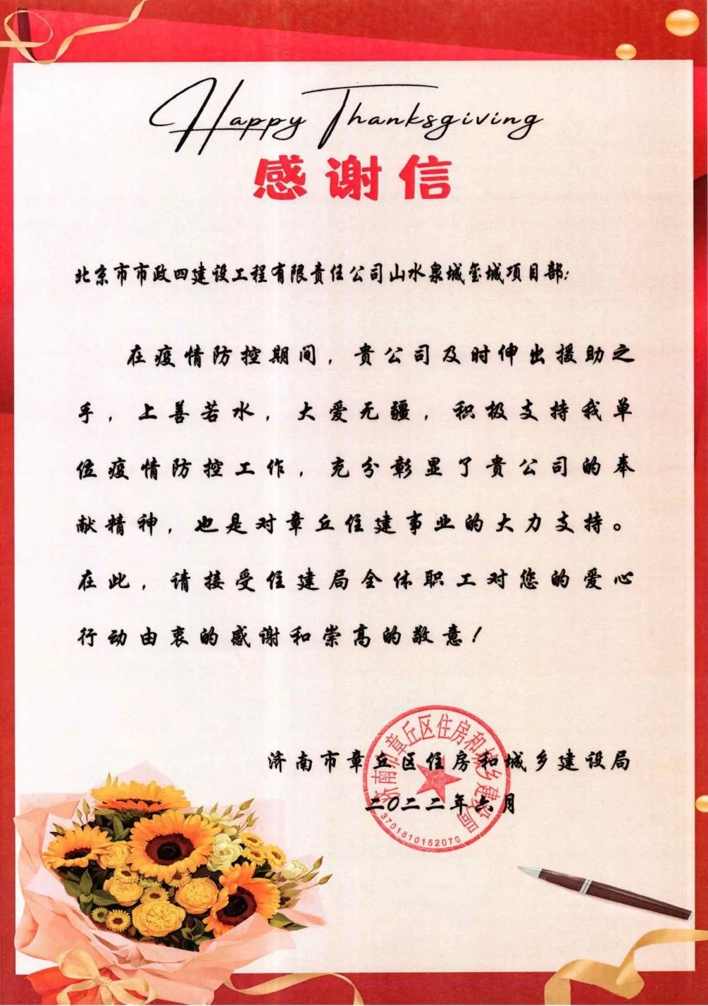 近日,山水泉城玺城项目因在疫情防控工作中的积极表现,受到济南市章丘区住房和城乡建设局的表扬和感谢。新冠肺炎疫情期间,项目团队始终坚持“走在前,做表率”,面对复杂多变的疫情形势多次召开会议,快速反应,坚决服从当地防疫政策,筑牢全局“一盘棋”思想。