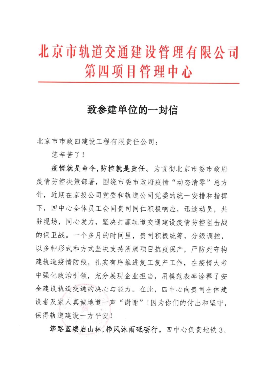 近日,公司收到业主单位的感谢信,信中对12号线各项目抗疫保产、筑牢轨道疫情防线表示感谢,并表达了齐心协力、共克时艰,奋力书写轨道交通建设新时代答卷的坚定信心。