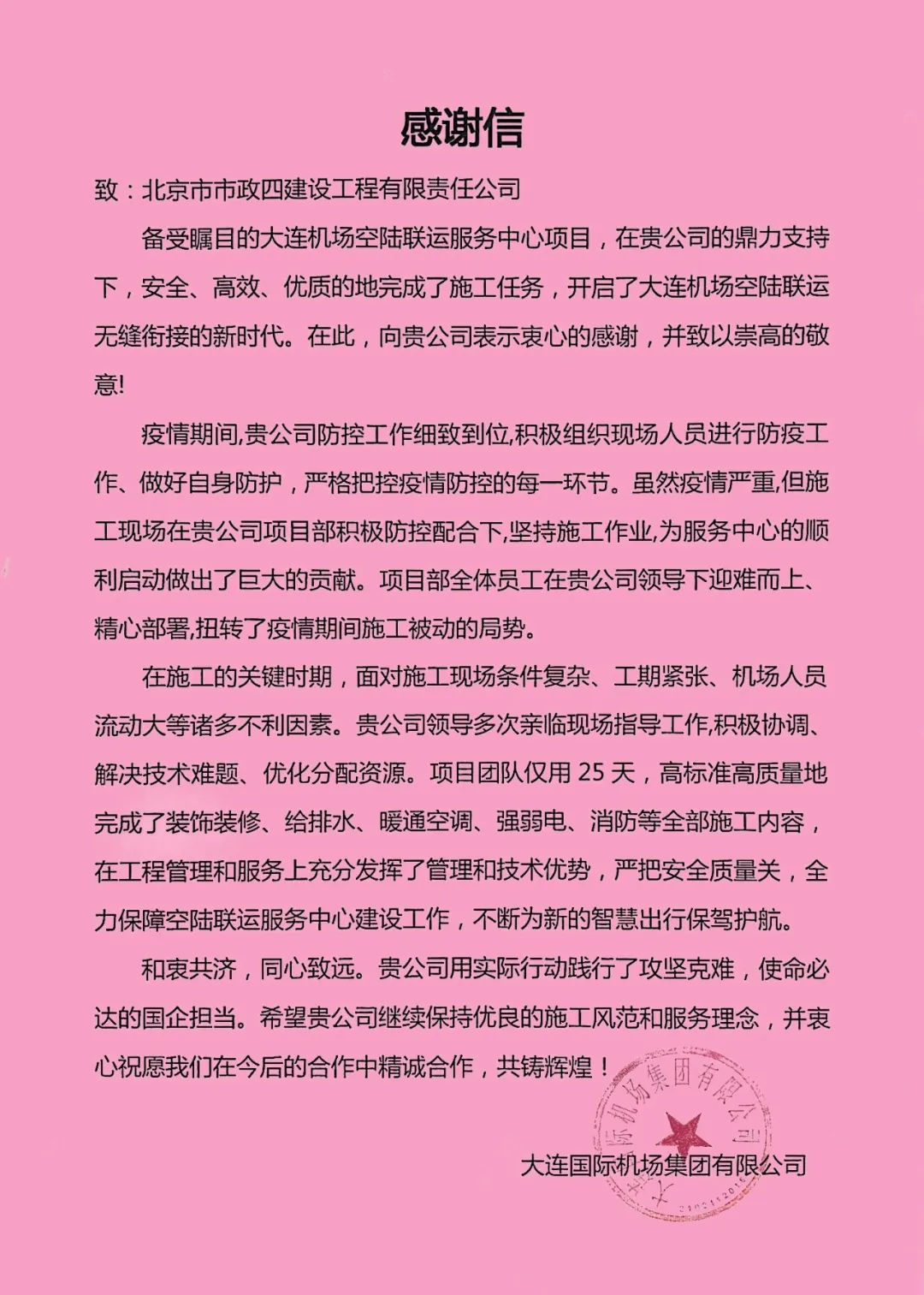 近日,东北分公司收到大连国际机场集团的一封感谢信,感谢公司在疫情期间大干快上,扭转了被动施工局面,全力推进空陆联运服务中心建设工作,为智慧出行保驾护航。