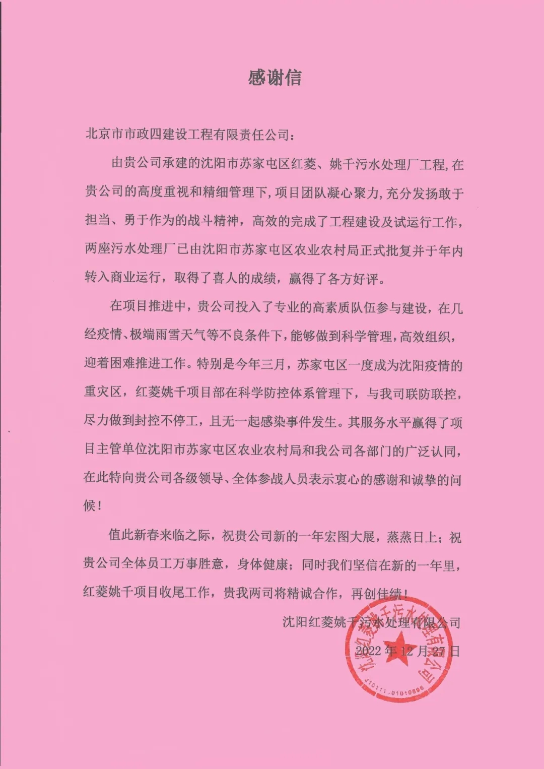 12月27日,公司收获沈阳红菱姚千污水处理厂业主单位发来的感谢信,对公司迎难而上、勇挑重担的精神表示敬佩,对项目团队高效、顺利的完成建设任务,保障运行投产表示感谢。