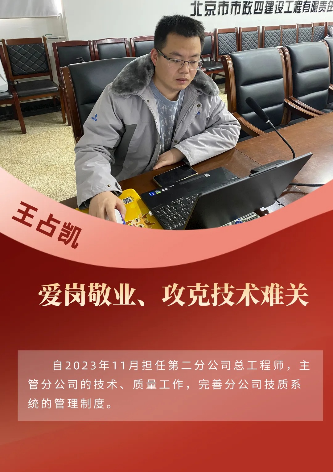 王占凯同志积极做好第二分公司的技术、质量管理工作,帮助项目对工程质量管理及创优活动进行策划、控制、管理及监督,协助项目开展科技创新、高新归集工作、奖项申报,建设工程QC小组活动和技术、质量攻关工作,自2018年至今获得多项北京市协会QC奖项,管理项目获得“北京市市政基础设施结构长城杯”。