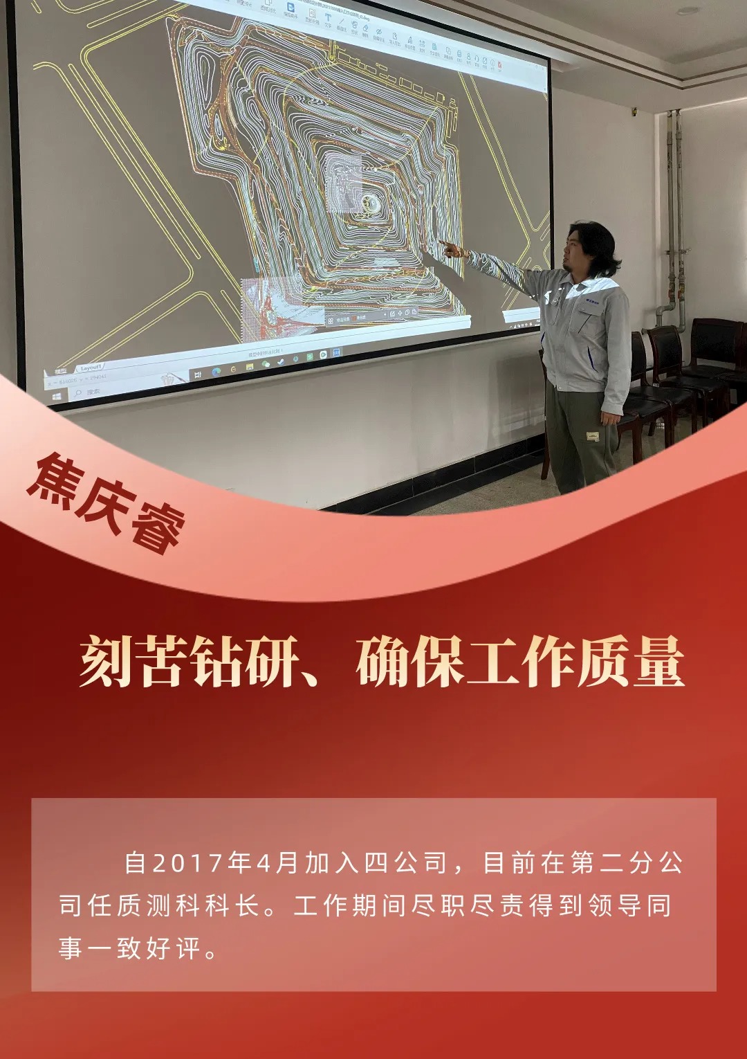 焦庆睿先后负责了瀛海再生水厂项目、新航城二期热力项目、北京西站零星项目等多个项目的技质、工程相关工作。他始终以“精益生产”的质量管理原则为核心,认真处理每个项目的每个环节。无论是试验、内业或是施工过程中的沟通、协调,他总是兢兢业业的完成项目上的各个细节。