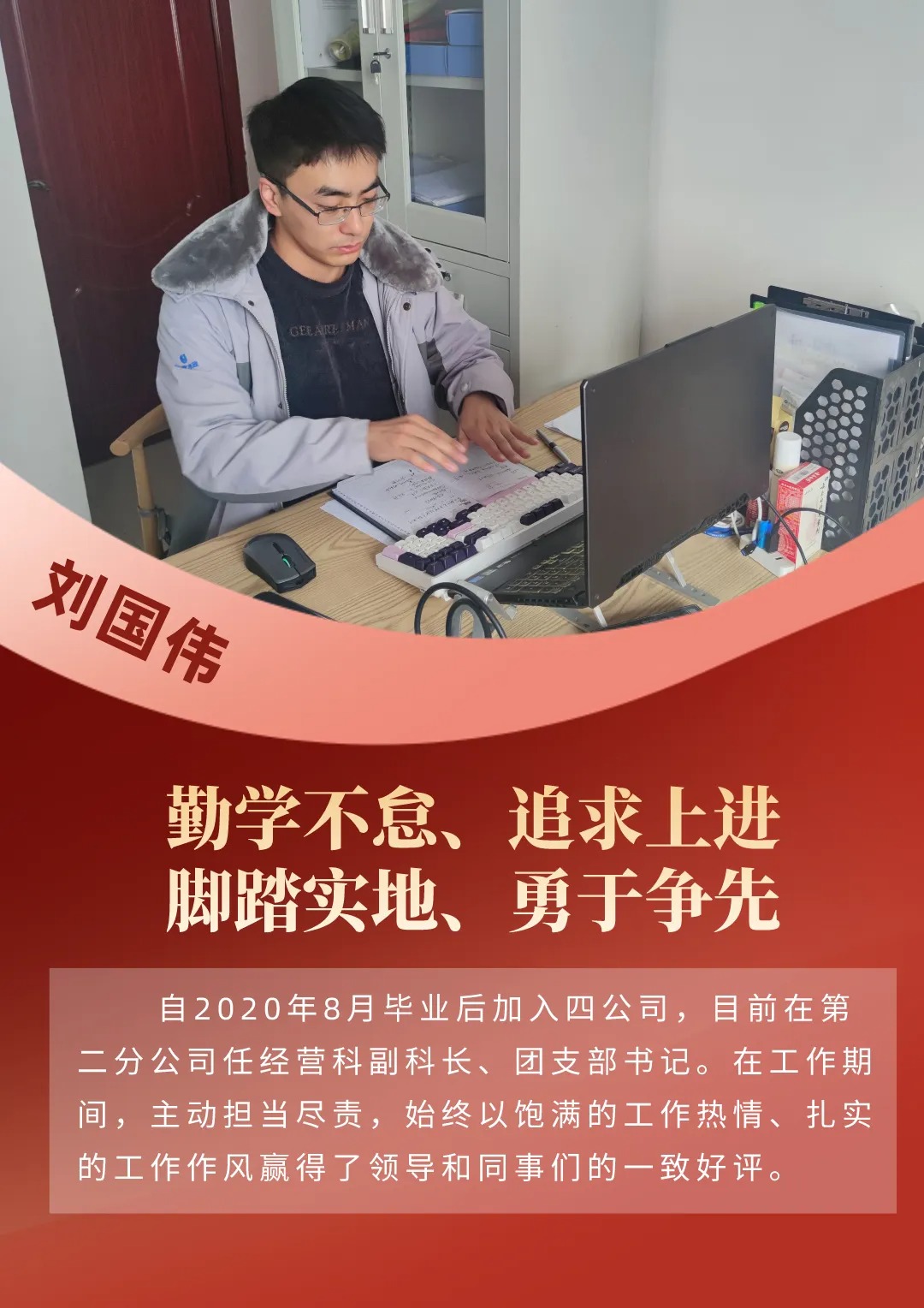 刘国伟作为一名新时代青年,自参加工作以来,能够对工作保持一颗热忱之心,稳扎稳打,在工作和活动中都能做到有思想有主见。他先后参与了首体南路装修项目、潇河光伏产业园220kV供电工程(一期)等多个项目的经营相关工作。最大程度保障好前期招投标、合同签订阶段各个细节;过程中计量核量、对下审核谈判;工程竣工结算中据理力争,及时向领导联系汇报,争取公司的最大利润,切实维护了公司的利益。
