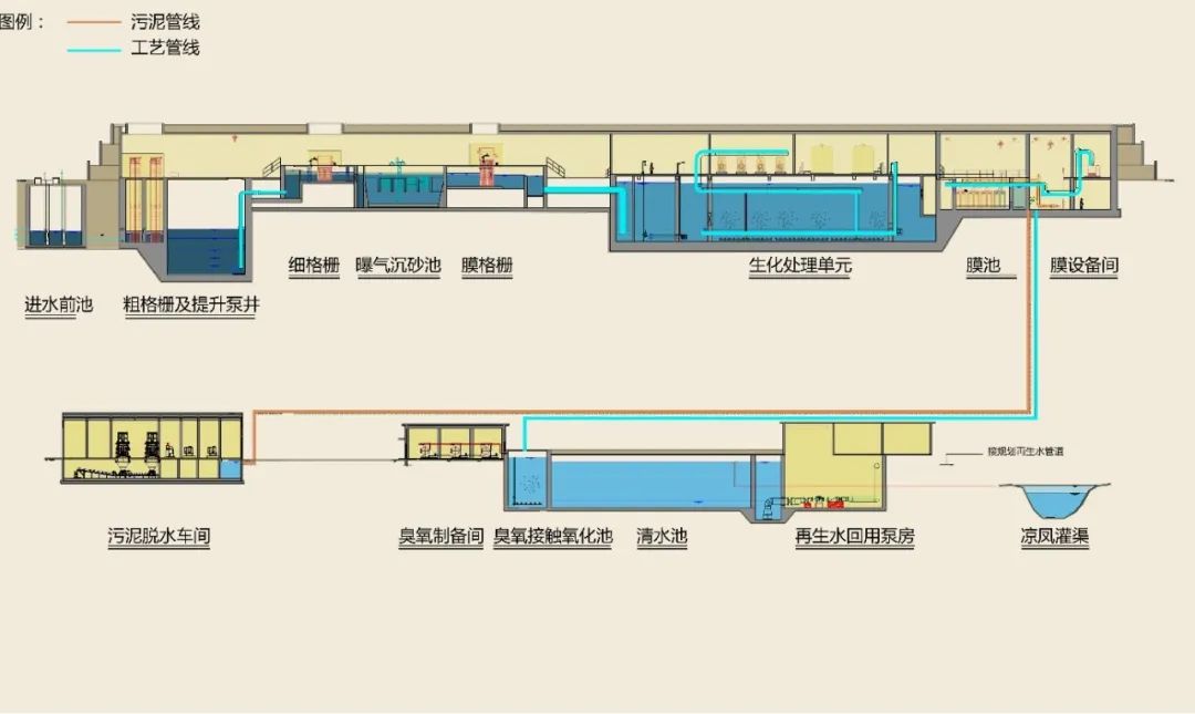 本工程设计处理规模为2.5万立方米/天,再生水供应设施规模为2万立方米/天,总用地面积6.19公顷,其中一期用地面积3.25公顷,建筑面积16735.63平方米。污水处理工艺采用“预处理+A²/O+MBR+臭氧接触氧化+次氯酸钠消毒”工艺,出水一部分作为再生水回用,剩余的排入凉凤灌渠(Ⅳ类水体),最终汇入新凤河。污泥采用“污泥贮池+叠螺浓缩脱水+高压隔膜压滤脱水”处理工艺,脱水后污泥含水量≤60%。