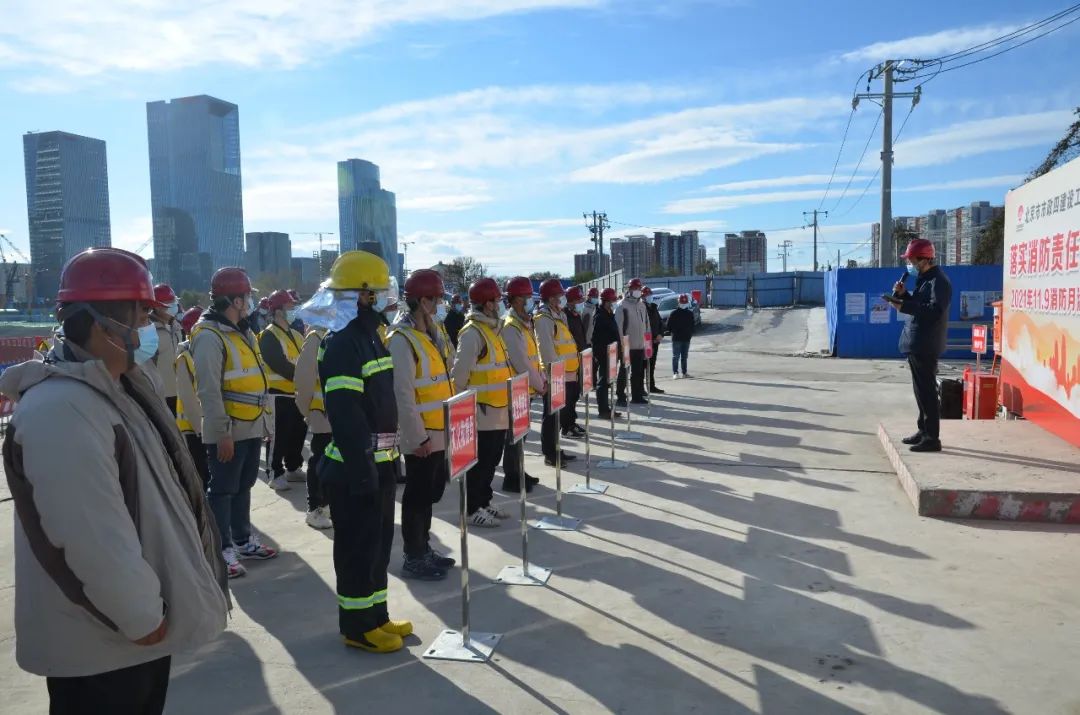 为持续增强消防安全意识,做好秋冬季火灾防控工作,深入贯彻落实消防月活动安排,围绕“落实消防责任,防范安全风险”的消防月主题,公司在北京地铁16号线20标丽泽始发井施工现场组织召开2021年度“119”消防月宣传日活动暨冬防工作现场会,公司副总经理陈建华、安全总监徐耕、各部室代表,京内各单位书记、安全负责人、行政后勤负责人参加活动,活动由安全管理部副部长胡林涛主持。