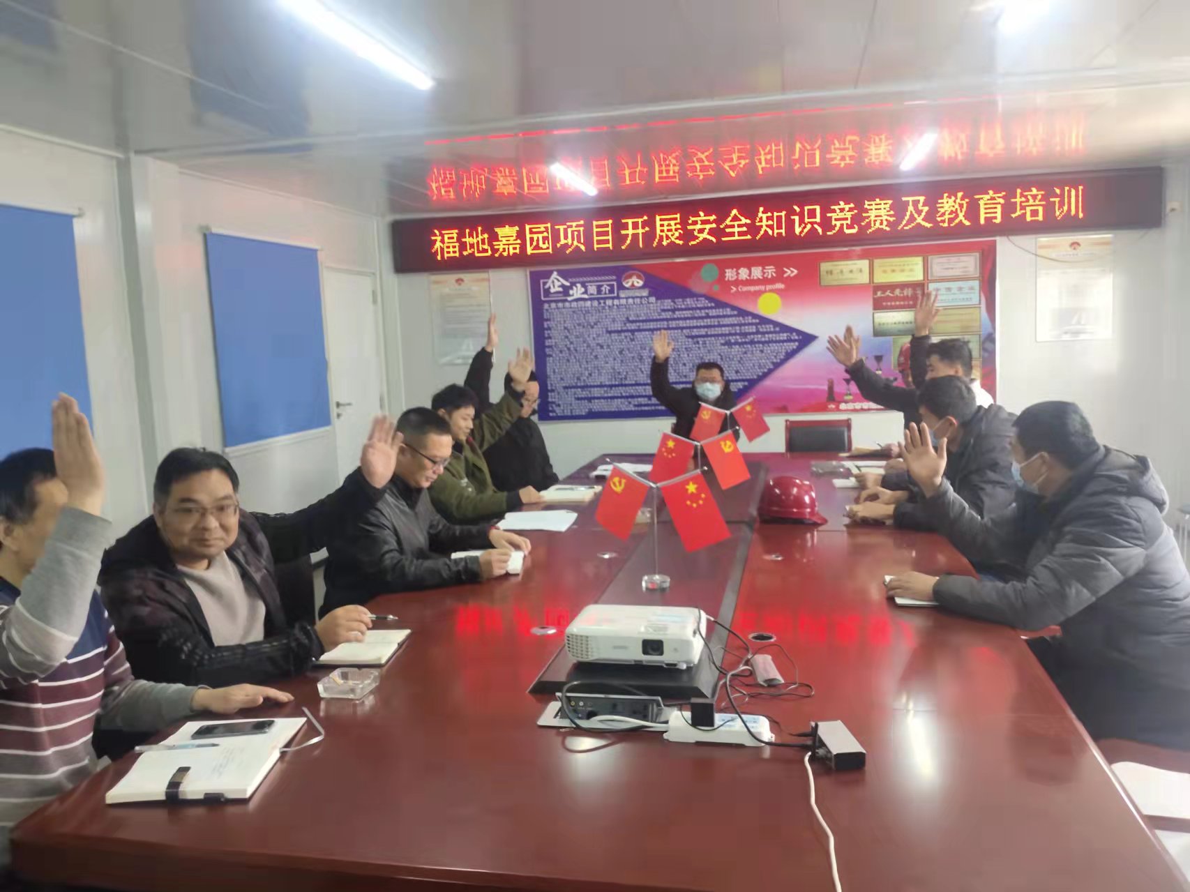项目安全员及各在职党员发挥模范带头作用,提高施工现场安全管理水平,每月组织现场施工人员开展内部安全知识竞赛活动,并设立流动红旗,大力推广安全学习氛围。党员每周向全体施工劳务人员进行安全动员讲话,强化施工人员的安全意识,让安全理念真正入心。