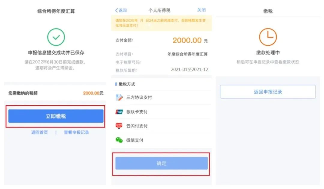 申报结果为补税的,跳转到缴税页面,可点击“立即缴税”,通过三方协议支付、云闪付、银联卡支付、微信等多种方式完成缴税。