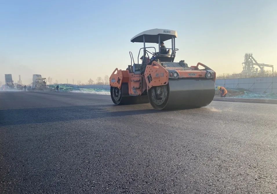 2021年12月28日,山东分公司济南市济钢片区市政道路建设一期工程(EPC)工程总承包三标段完成机动车道第一层沥青摊铺施工,实现2022年元旦前顺利通车节点目标!