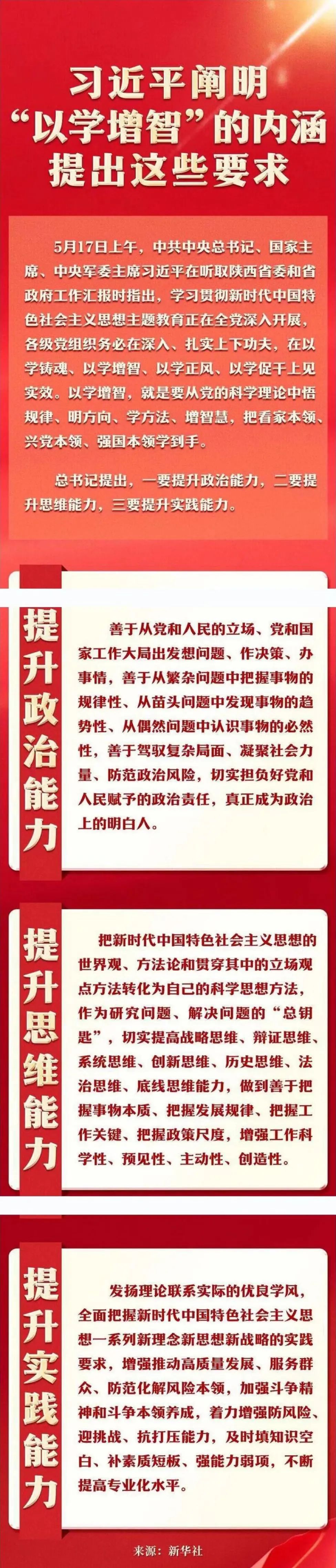 5月17日上午,中共中央总书记、国家主席、中央军委主席习近平在听取陕西省委和省政府工作汇报时指出,学习贯彻新时代中国特色社会主义思想主题教育正在全党深入开展,各级党组织务必在深入、扎实上下功夫,在以学铸魂、以学增智、以学正风、以学促干上见实效。以学增智,就是要从党的科学理论中悟规律、明方向、学方法、增智慧,把看家本领、兴党本领、强国本领学到手。看图学习如何做到“以学增智”。