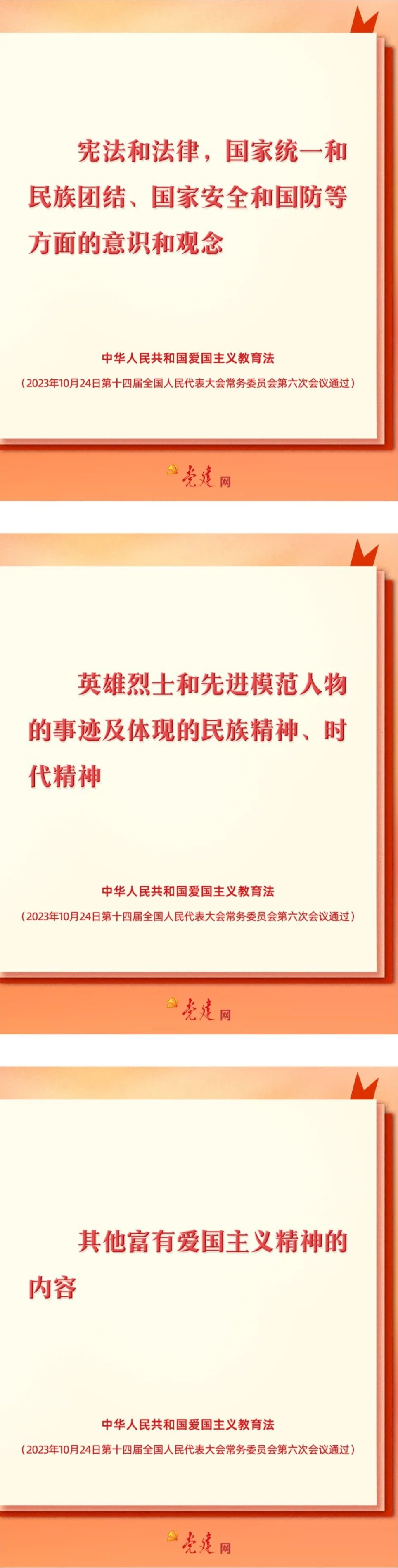 十四届全国人大常委会第六次会议10月24日表决通过《中华人民共和国爱国主义教育法》,自2024年1月1日起施行。快来一图学习爱国主义教育的主要内容!