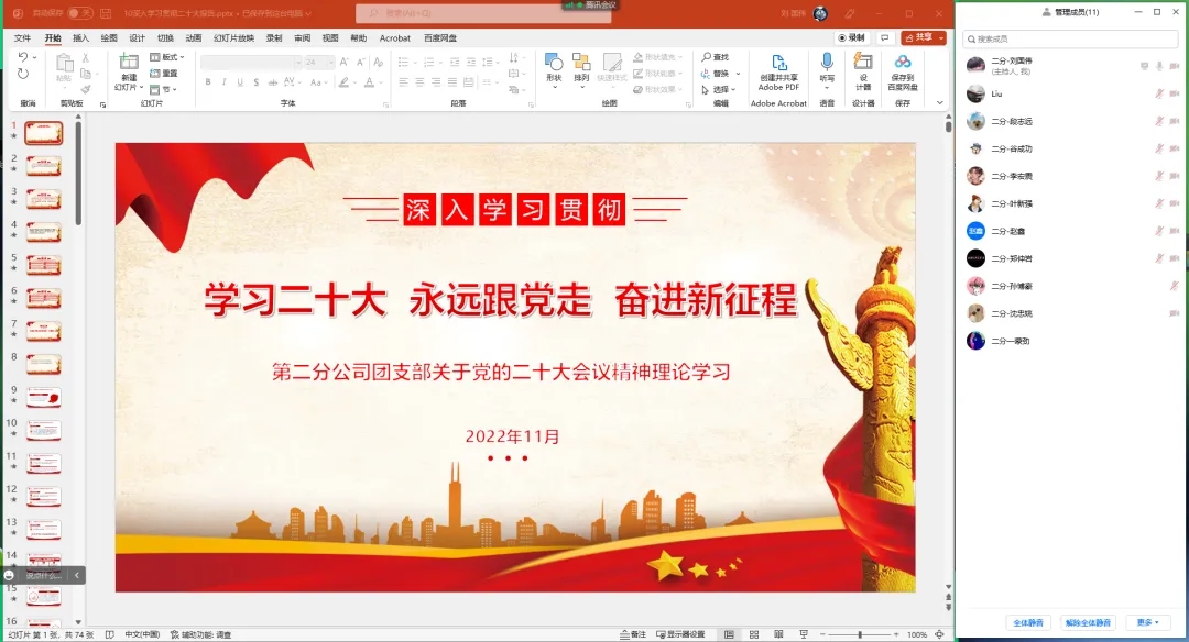 第二分公司团支部通过“线上线下”相融合方式,深入学习贯彻党的二十大精神,充分感悟其精神实质,提升青年一代的责任感与使命感。在线上,采取腾讯会议形式,深入交流讨论,营造浓厚氛围,引导团员青年深刻感悟报告的丰富内涵,立足当前工作实际践行党的二十大精神。以微信群为载体,依托共青团中央、青春北京等公众号资源,通过分享党的二十大关键性知识点,组织团员青年开展线上自主学习。在线下,在统筹做好疫情防控工作的同时,充分发扬“以党带团”的优良传统,通过一起观看大会直播、专题学习、交流讨论等形式集中深入学习。