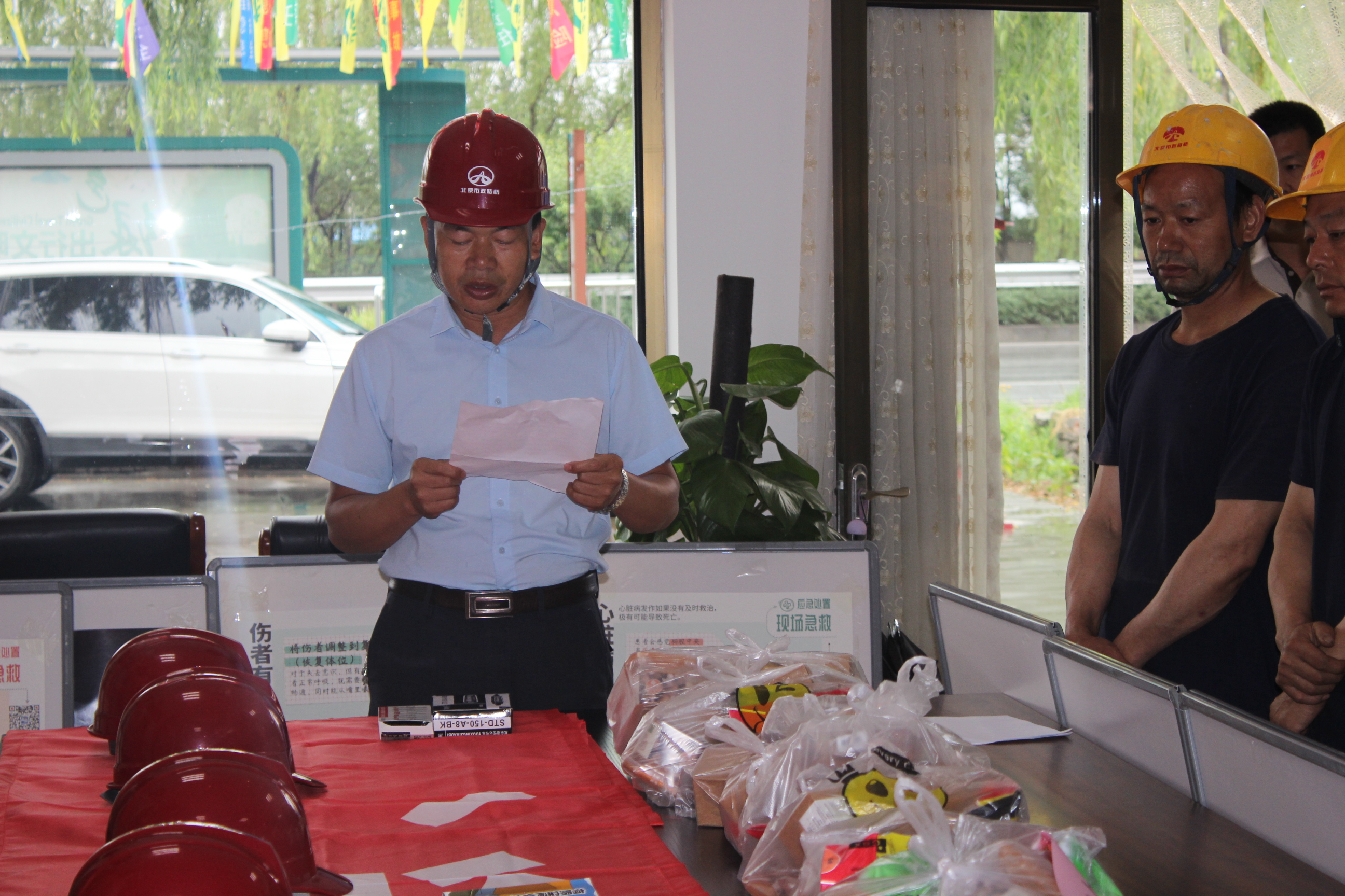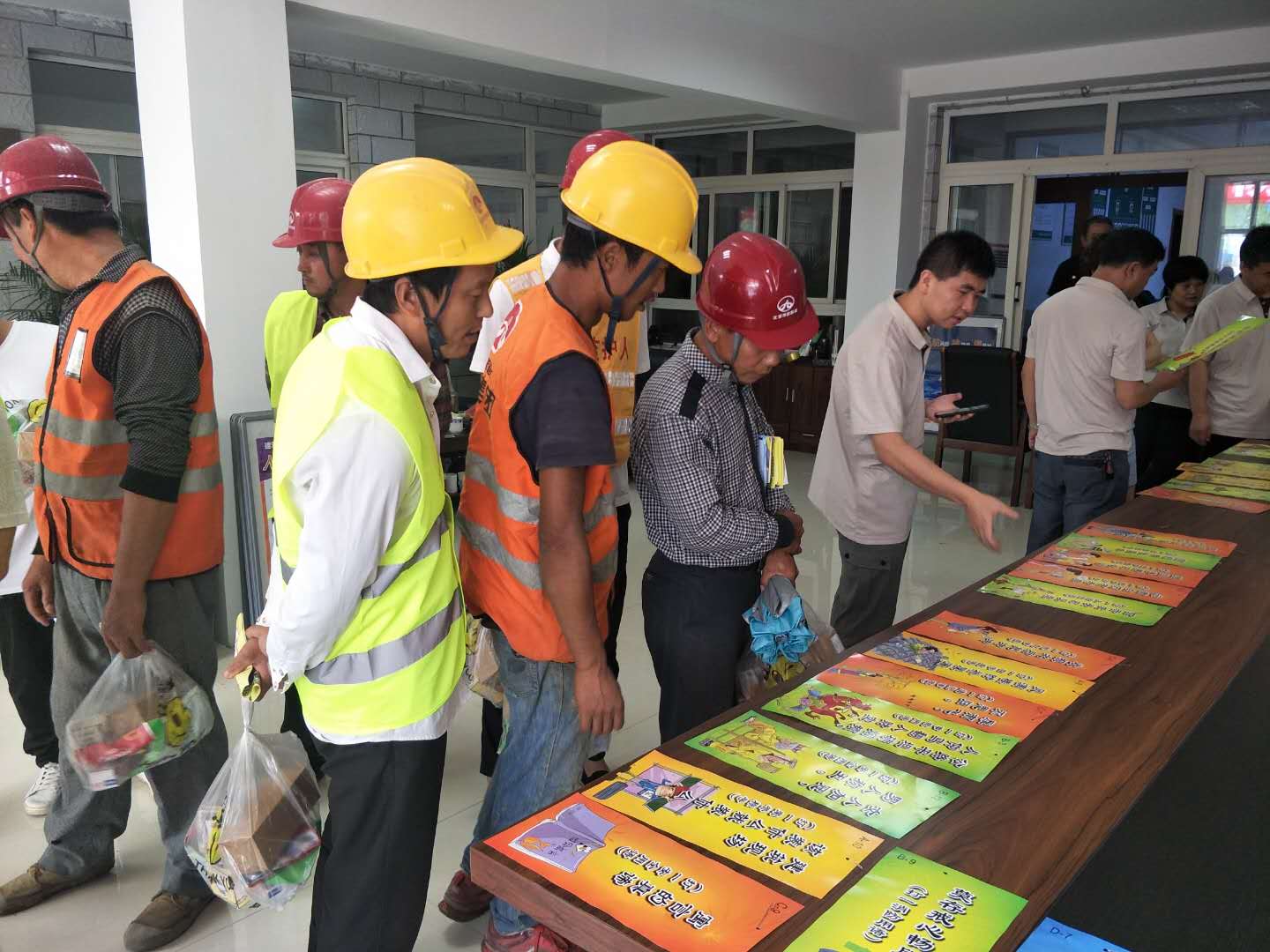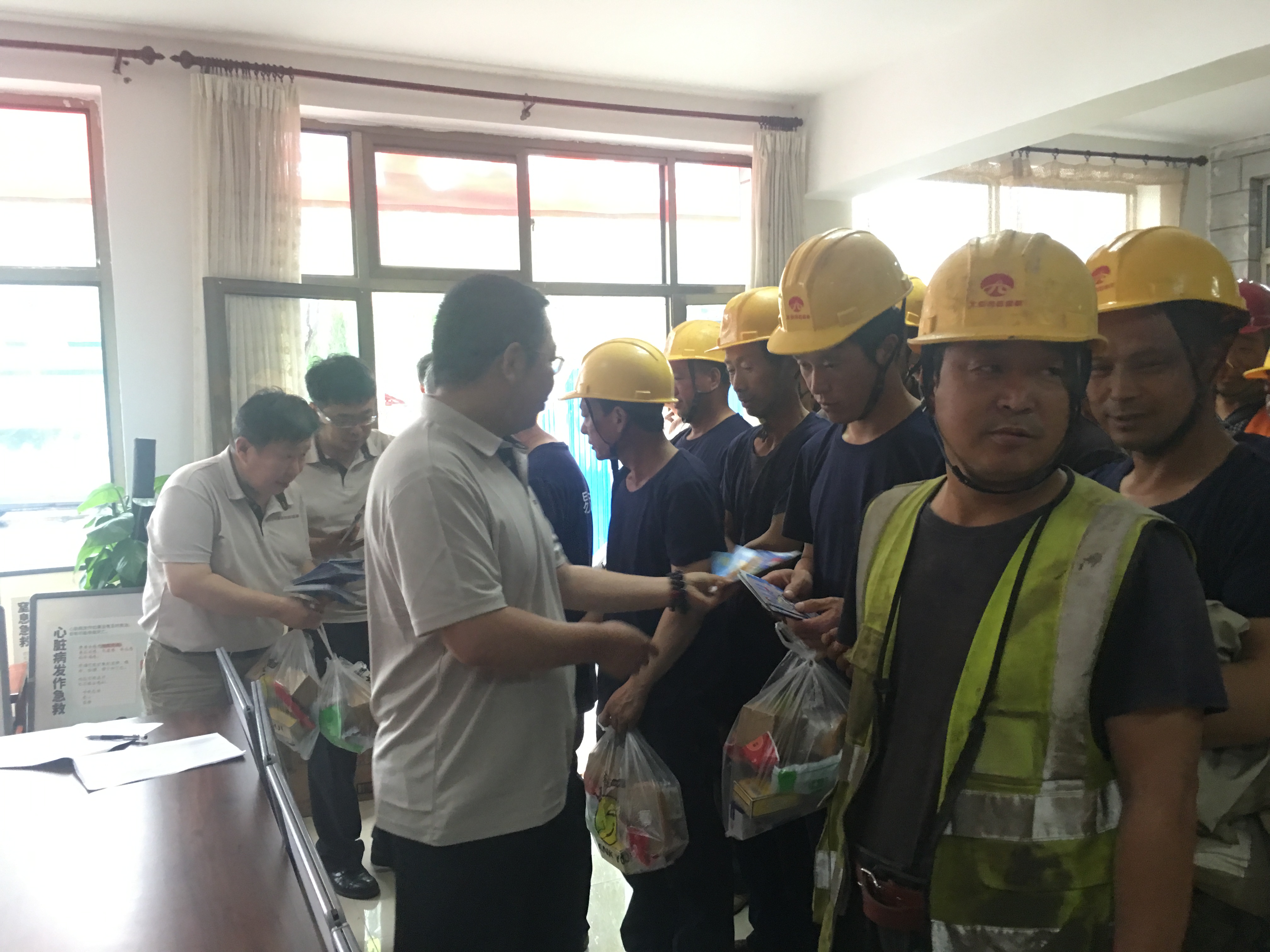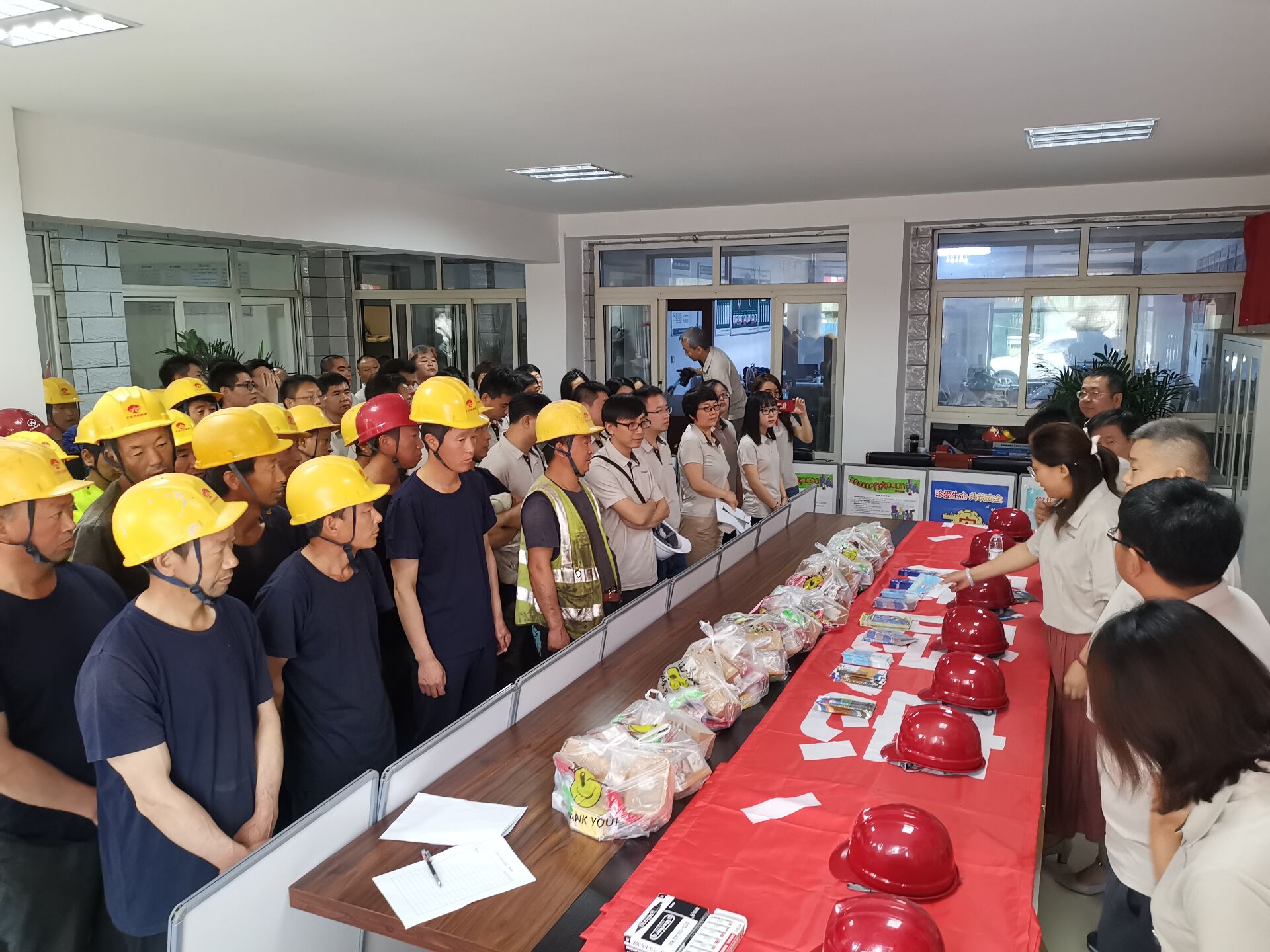 随后,与会领导为施工人员发放安全宣传资料及慰问品,并在安全条幅上集体签名。