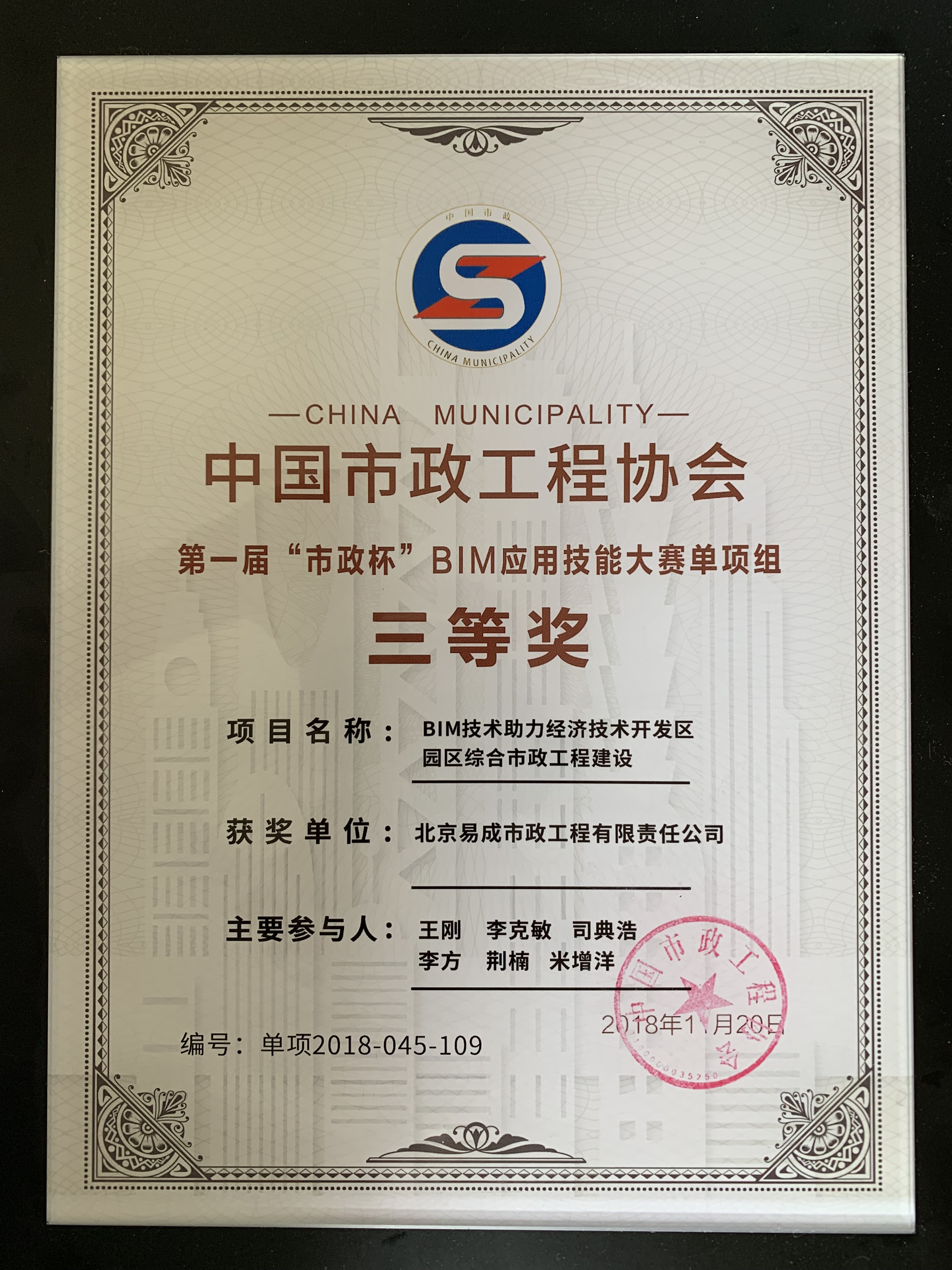 易成公司荣获第一届“市政杯”BIM应用技能大赛单项组三等奖